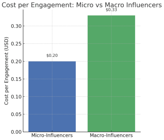 研究表明,头部达人一条 Instagram 帖子的收费可能超过 5000 美元,而小网红则通常只收取几百美元,甚至仅接受产品作为报酬。这意味着,一个头部网红的费用,可以抵得上几十个小网红。相比之下,小网红的性价比更高。平均而言,小网红每次互动的费用约为 0.20 美元,而大型网红约为 0.33 美元。每次互动节省 40% 的成本,可以带来更高的投资回报率。