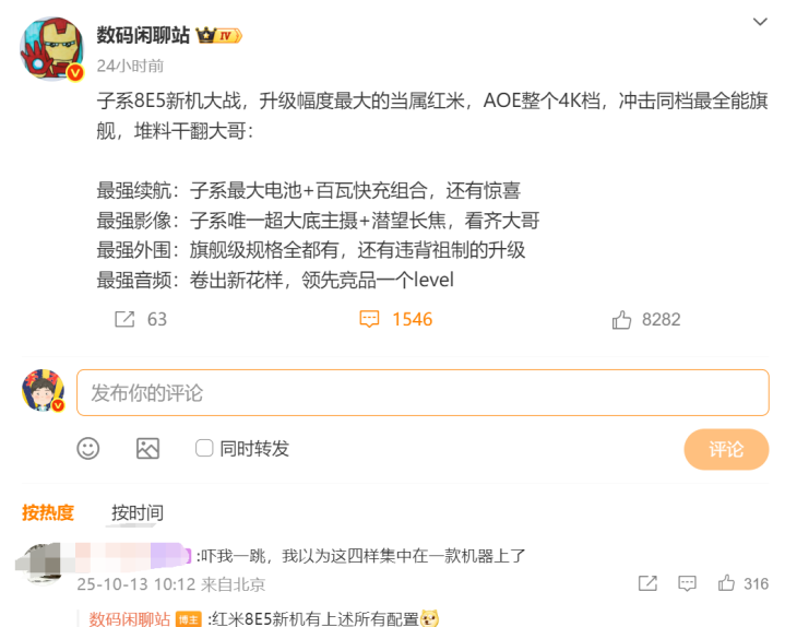 博主数码闲聊站爆料,红米K90 Pro是所有子品牌中升级最大机型,影响所有4K价位段机型,冲击同档位最全能旗舰。一方面可以和一加15、iQOO 15等友商竞争,一方面直接影响小米17标准版,堆料方面干翻老大哥领先竞品一个段位。