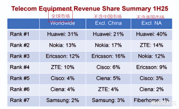 据相关数据显示,2025年第一季度数据呈现出一幅与美方预期完全相反的图景。华为不仅保持全球第一,份额进一步增长至31%,呈现“断崖式领先”态势。更令人惊讶的是区域市场表现,在排除北美市场后,华为的份额高达40%,展现出在国内市场之外的强大竞争力。