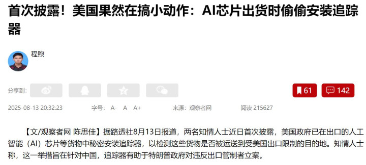 最近英媒曝料称,美国对华出口的一些AI芯片预装了“后门”。
