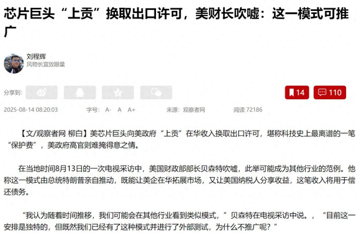 美财长贝森特吹嘘称,特朗普这招是独创,有着“一箭三雕”的效果,既能扩大美企在华芯片市场的份额,又能让美国的纳税人分享一些红利,还能帮助联邦政府化解债务危机,有必要把这招推广下去,这意味着接下来“黑手”将伸向更多美企。