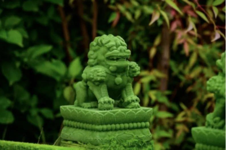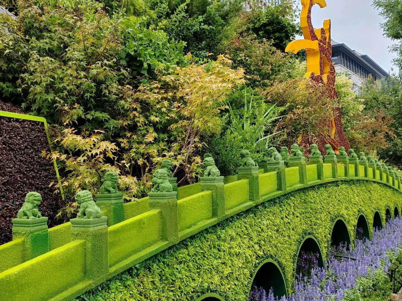 雕塑剪影人物采用穴盘苗栽植工艺,卢沟桥上的狮子采用3D打印与植绒工艺。