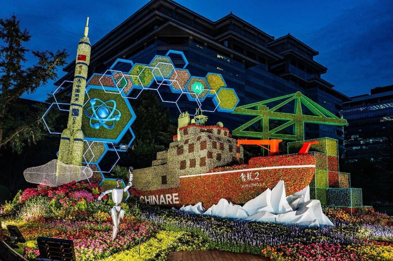 地面花卉布置,规则式与自然式配置相结合,神舟二十号下选择大量红色系、黄色系植物自然组合,雪龙2号下选择蓝白色系植物,模拟大海与碎冰效果。通过花境过渡,自然切换到智能集装箱场景下。