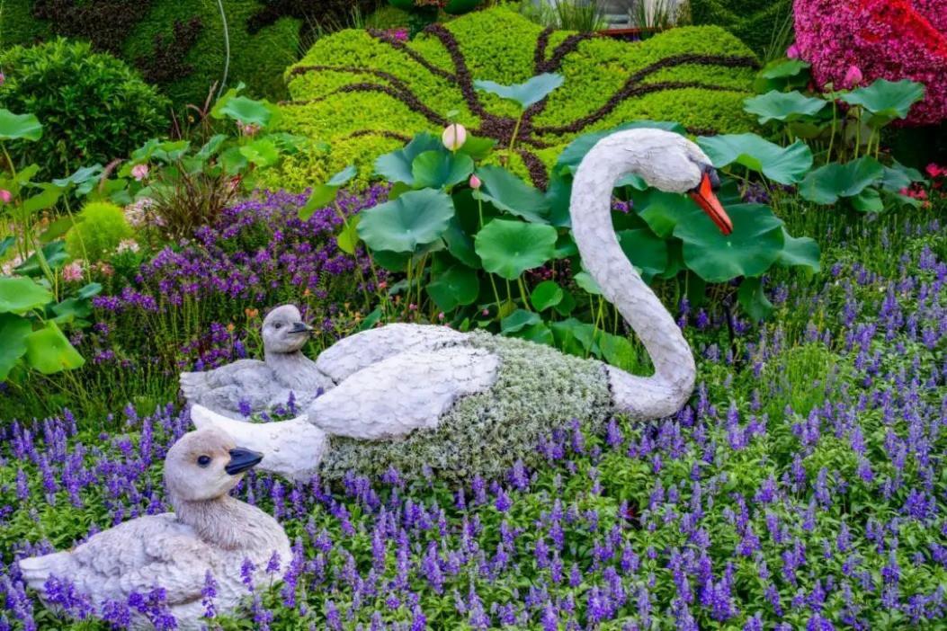 大天鹅采用花艺手法,头部、脖颈、翅膀采用银叶菊叶片层层粘贴,呈现层叠翎毛的效果。