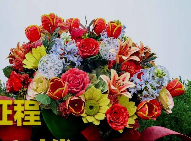 花束中的花朵,蒲公英象征“希望与坚韧”,月季“黄和平”象征着幸福、光荣与和平,百合象征着“幸福美满,纯洁无瑕、庄严圣洁”,郁金香象征友谊长存。